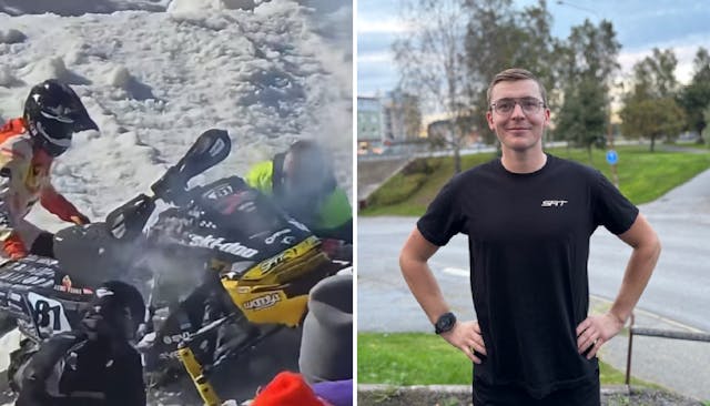 Det blev dramatiskt under helgens skotercrosstävlingar i Amsoil championship i USA. Gustav Sahlstens skoter fattade plötsligt eld under ett träningsvarv...