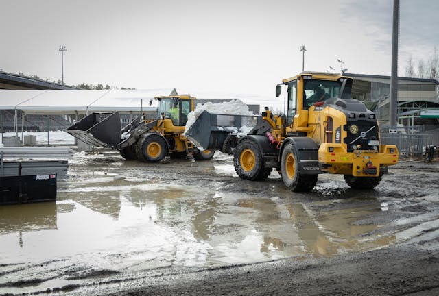 Det milda vårvädret fortsätter försvåra förutsättningarna för SM-veckan. 20 000 liter vatten var tvunget att sugas bort och mängder med bärlager har körts till vallabyn bredvid skidstadion vid Umeå En..