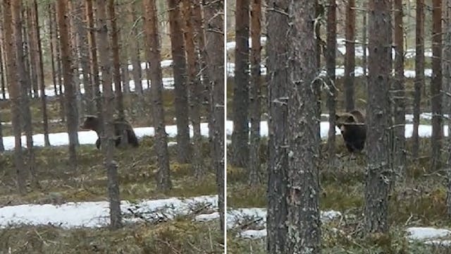 Josefine Wägstam fick sällskap av en förmodligen ganska nyvaken björn när hon på onsdagen körde bil längs E12. Det sista hon såg av björnen var att den sprang i riktning mot en hästgård...