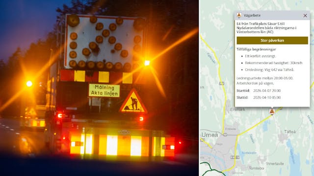 Från och med tisdag kväll stängs ett körfält av på E4 mellan Nydalarondellen och Sävar. Ett ledningsarbete gör att trafiken leds om längs väg 642 via Tomtebo, Innertavle och Täfteå...